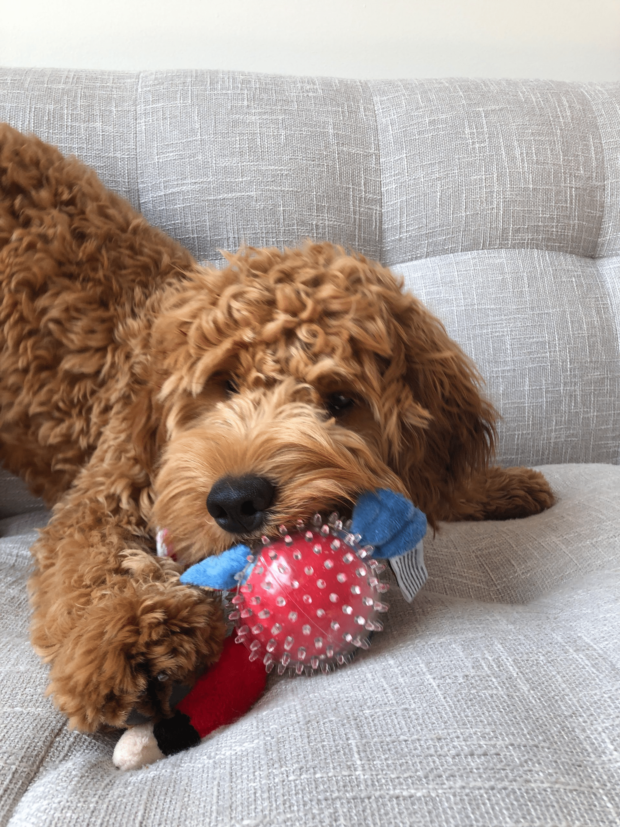 Multi-textured fun with a soft, squeaky plush inside a bouncy, textured ball.