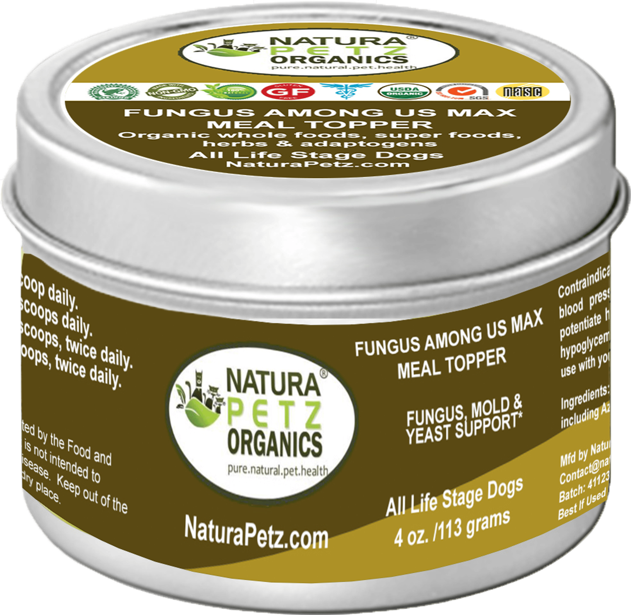 FUNGUS AMONG US MEAL TOPPER may help provide broad spectrum protection against yeast, infection, pathogen and allergen triggers, may help encourage healthy native gut flora and bacterial balance in the digestive and elimination tracts, may help support balanced adaptogenic immune response (up regulated or down regulated response as needed), may help support proper intestinal lining and collagen production, may help promote cellular protection against unhealthy cellular mutagenics (cell damage and death), may help encourage nutrient assimilation, may help regulate excessive mucous production, may help reduce food and environmental sensitivities and may help support healthy skin and coat.