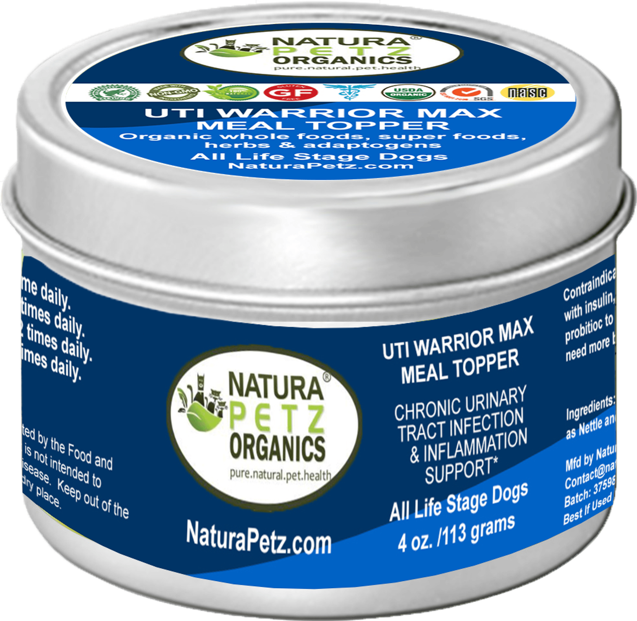 UTI WARRIOR MAX MEAL TOPPER* is also used adjunctively to help reduce symptoms associated with kidney and liver disease and dysfunction; may help reduce uric acid; may help normalize liver enzyme levels; may be useful in cases related to vaccinosis due to its natural plant chemicals that are strongly antiviral, antibacterial, antispasmodic and analgesic (pain relieving). (* As recommended by holistic veterinarians for use under a traditional medical system)