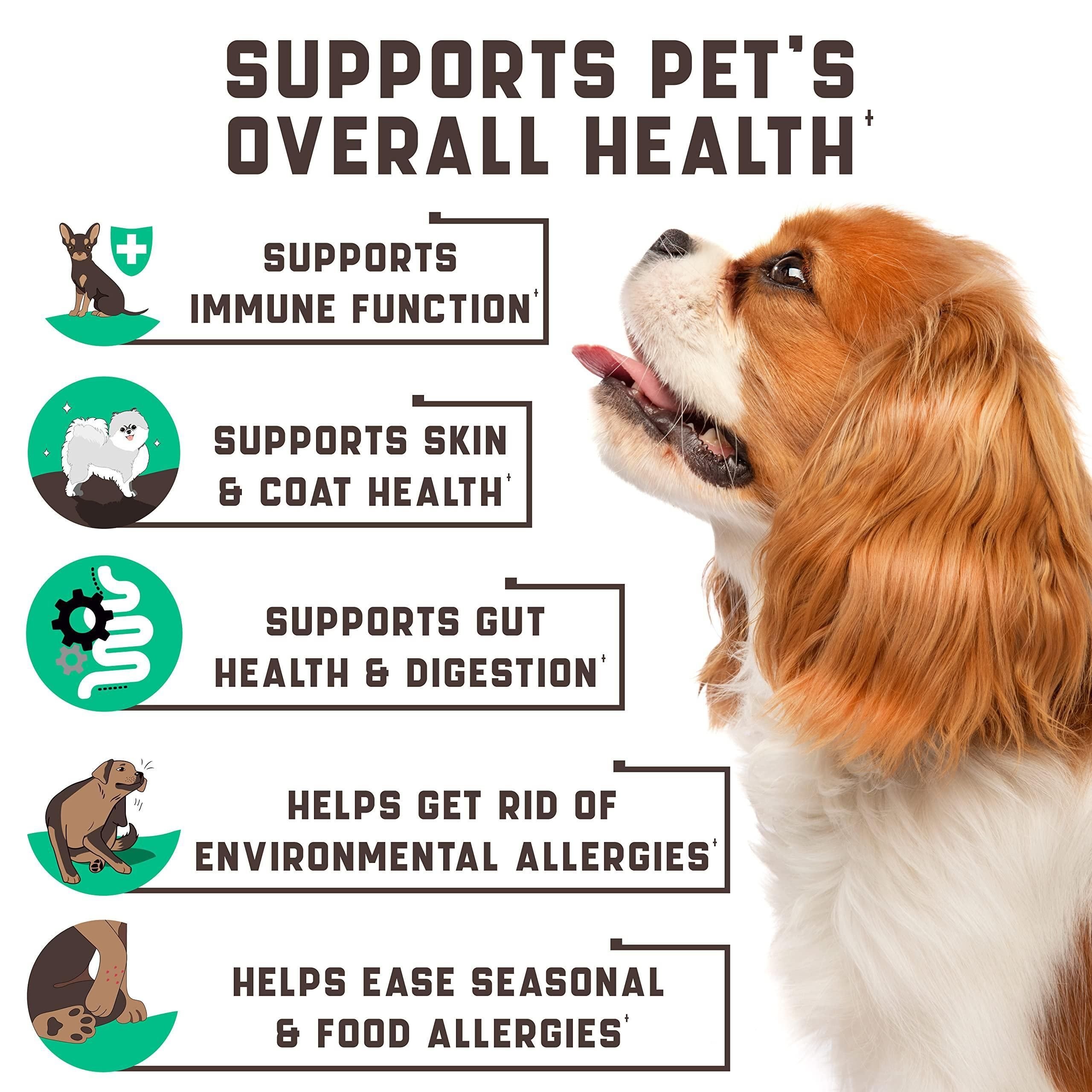 2.immune support: dog allergy supplement includes a powerful 5-strain probiotic blend for supporting your pet's immune system & digestion. allergy chews for dogs itching also help deal with ear, eye, nose issues.
