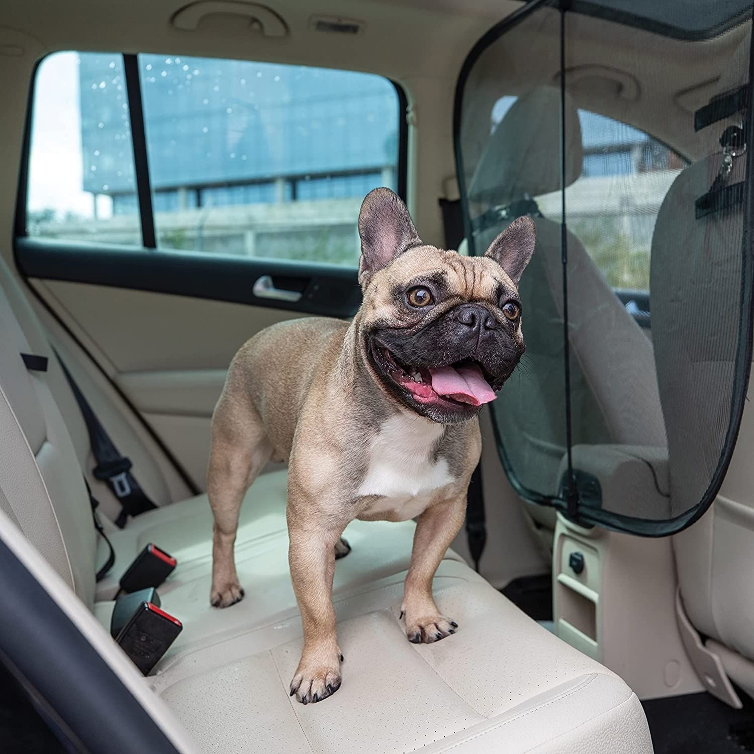 The PetSafe Happy Ride Dog Barrier is a see-through, lightweight, portable barrier for your vehicle. It works best with furry friends who are not overly eager or determined to visit you in the front seat.