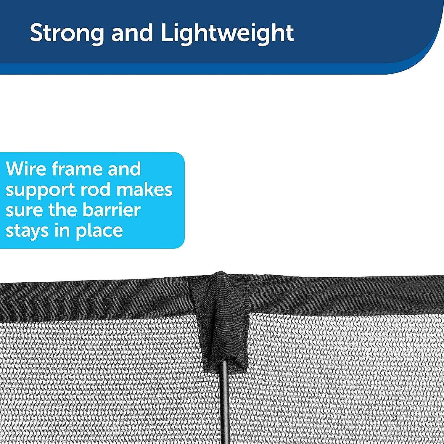 The mesh material is easy to see through, claw proof, and uses a pop up wire frame to retain its shape. The barrier uses adjustable straps to attach to vehicle headrests, and includes a handy pouch for quick storage.