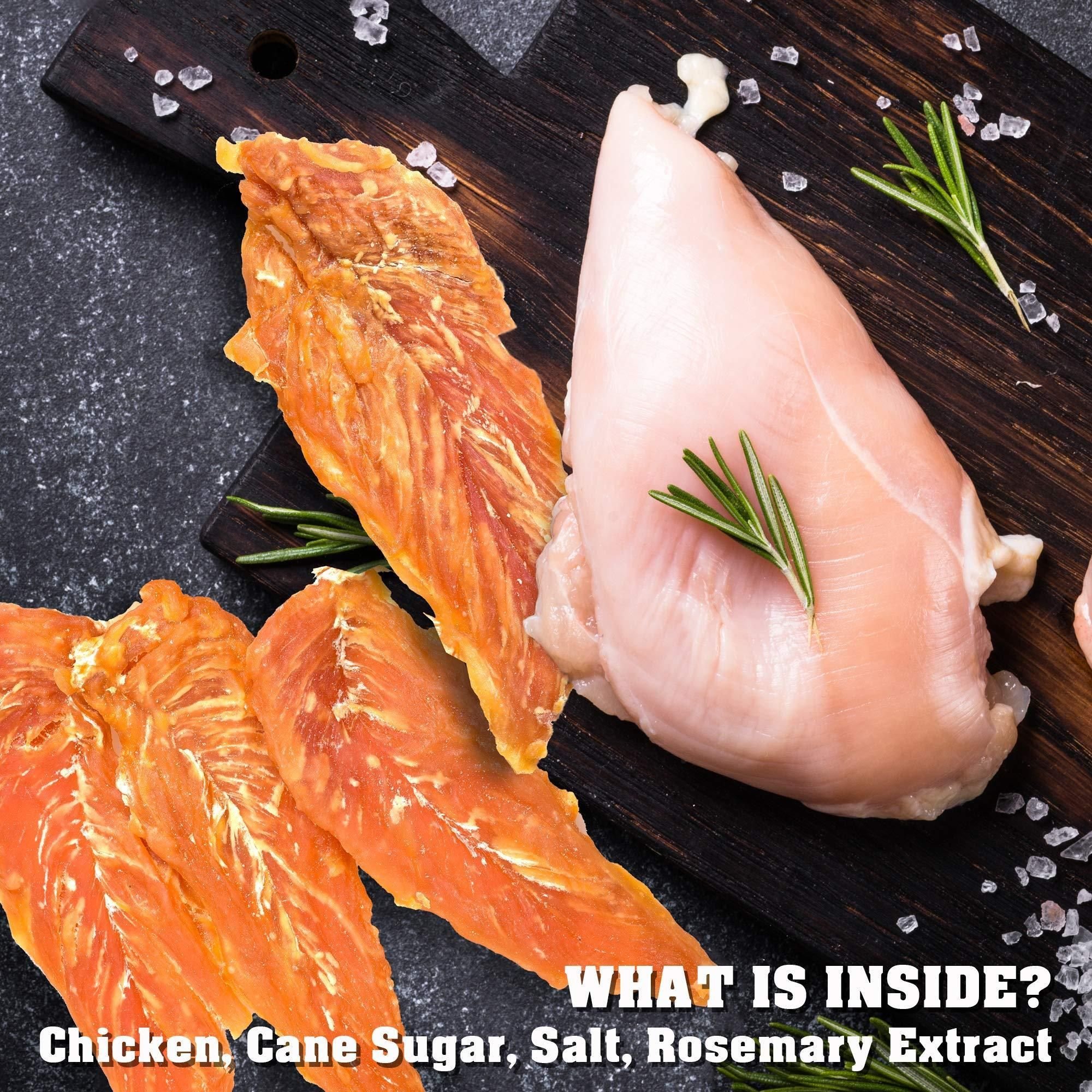 1.chicken jerky made of 100% chicken meat: you need to let your dog enjoy high quality natural and healthy food. it is right to choose our product. dog chewies are perfect for training, these top jerky will last a long time and can special promote dogs' teeth healthy. have less plaque and tartar. keeps dogs' jaws strong and breath fresher.