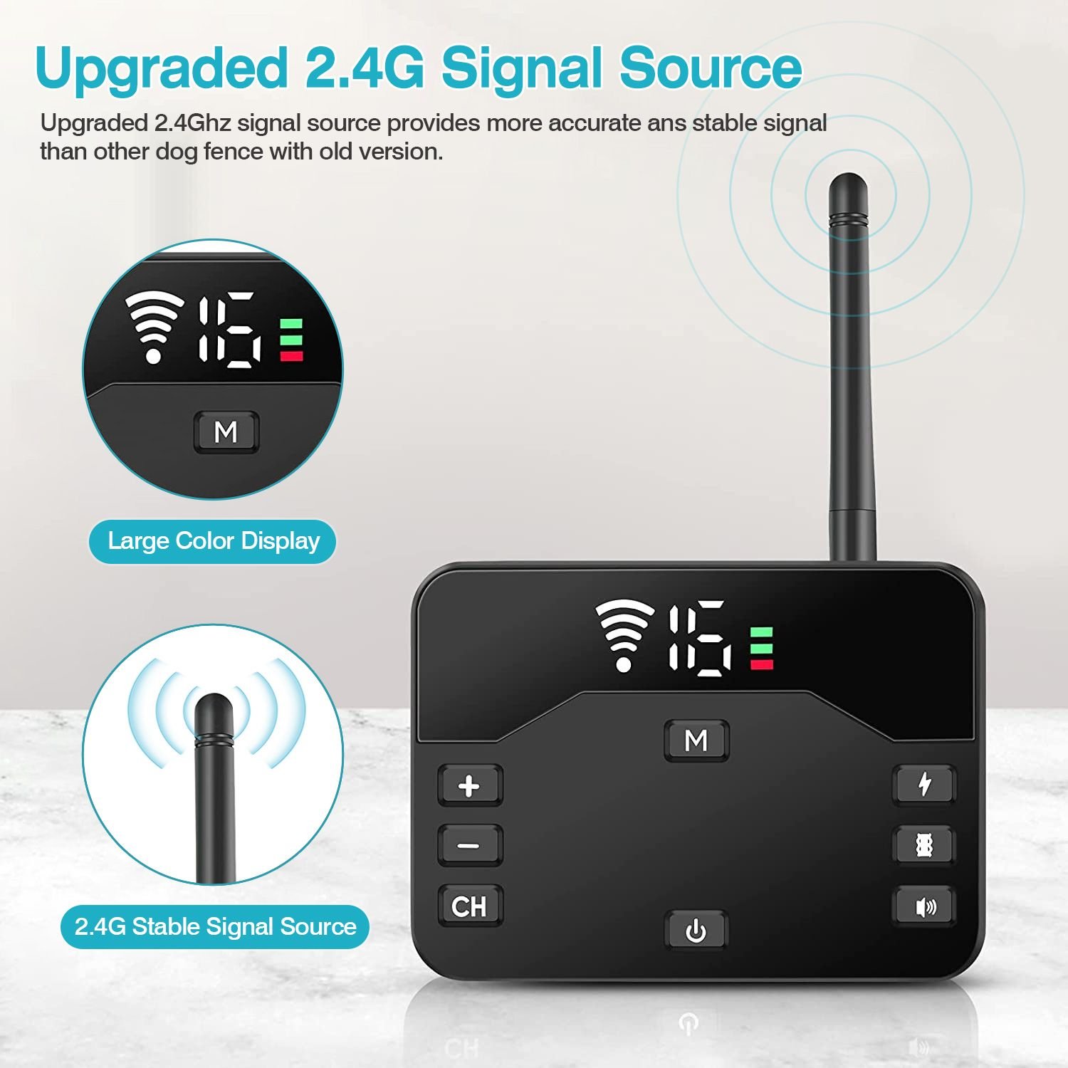 *Wireless Dog Fence Mode*:This dog fence system customize a wireless radial shaped boundary with 16 levels of distance with radius range from 20ft to 850ft. When your dog is out of range,the receiver collar will trigger sound,vibration and shock to your dogs,and these modes will stop until your dog go back to the circle. 1 Transmitter can connect with several receiver collars and all receivers will connect with the transmitter automatically once they power on.