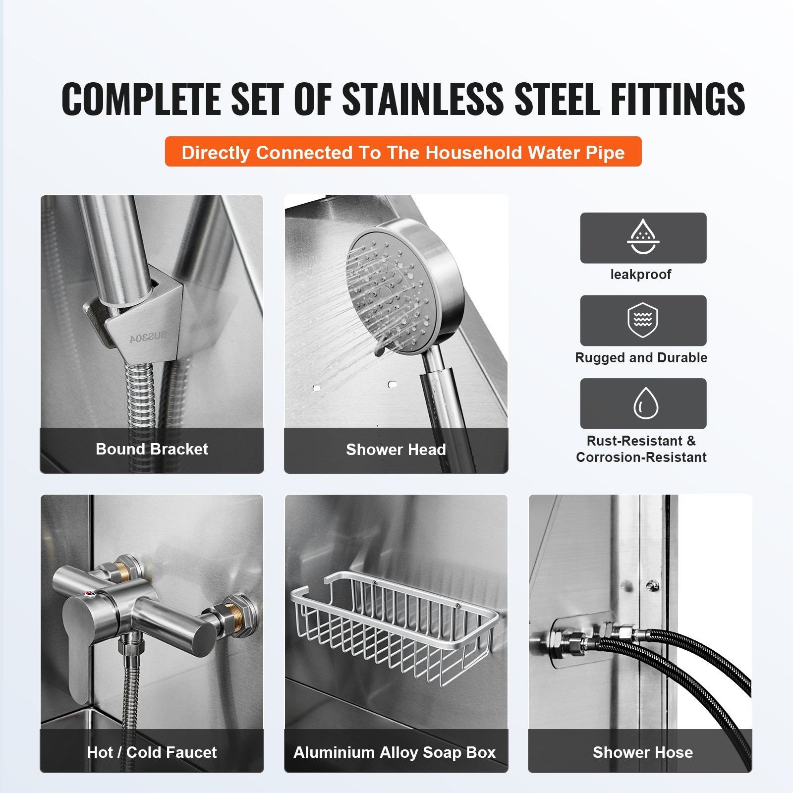 5.Stainless Steel Accessories: Equipped with a showerhead, faucet, and stainless steel support frame that can be connected directly to the household hose. They are rust-resistant and durable. An additional aluminum alloy soap dish is included for long-lasting use.