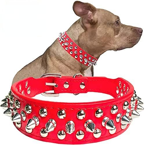 [BLACK LEATHER SPIKED COLLARS FOR MALE DOGS]Sturdy dog collar is made of soft microfiber PU leather. The D-ring which fits perfectly with almost all kinds of dog leashes; name tag. Your dog will love his new necklace and parad around showing it off. He will be a big hit! It screams bad to the bone and masculine at same time! [SPIKED DOG COLLARS]The spikes are not overly sharp; so it doesn't hurt your pet's skin and the studs don't pull dogs hair out. After wearing the studded collar; Your animals could not destroy the collar or being bitted around the neck because of the spikes. Gives them an added protection during cat/dog war play time! [ADJUSTABLE COLLARS FOR DOGS]XS: 8.3"-10.6"; S: 10.8"-13.2"; M: 12"- 15"; L: 15"-18.5"; XL: 17.7"-20.5"; XXL: 19.7"- 22.4". Suitable for puppies; small dogs; medium dogs and large dogs like Chihuahua; shih tzu; poodle; corgi; saluki; Jack russell terrier; pug; Pit bull; husky; Shiba; Boston terrier; French bulldogs; German shepherd; etc. [SURPRISED GIFT]Dog loves squeaky toys; There is a bonus squeaky ball. It's an adorable collar and ball set. Not Only an everyday collar; but also can be a "SEXY" Halloween costume. Great for using for fashion and walks. Lovely gift ready package! It's an amazing present for your or friends' dogs. [MEASURE BEFORE ORDER]There are our customers' size suggestions in the description part; please read before your order. Hope it helps. To save your time and money; kindly please measure your dog's neck carefully to make sure the correct size before your purchase; thank you.