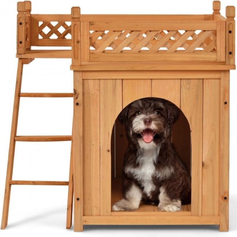 5.This wooden pet dog house is designed to complement and enhance your existing surroundings with a classic and appealing design that both you and your pets will appreciate. With sturdy side stairs and adorable balcony bed, your pet will surely love it and have a good res